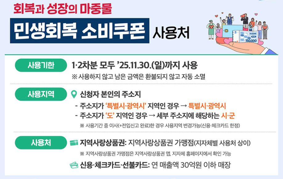 지급 방식은 신용·체크카드 포인트, 선불카드, 모바일·카드형 지역사랑상품권 중 선택할 수 있으며, 현금으로는 지급되지 않습니다. 소비쿠폰의 사용 기한은 2025년 11월 30일까지로, 사용하지 않은 잔액은 소멸 처리됩니다. 따라서 유효기간 내에 소비를 완료하는 것이 중요합니다.
